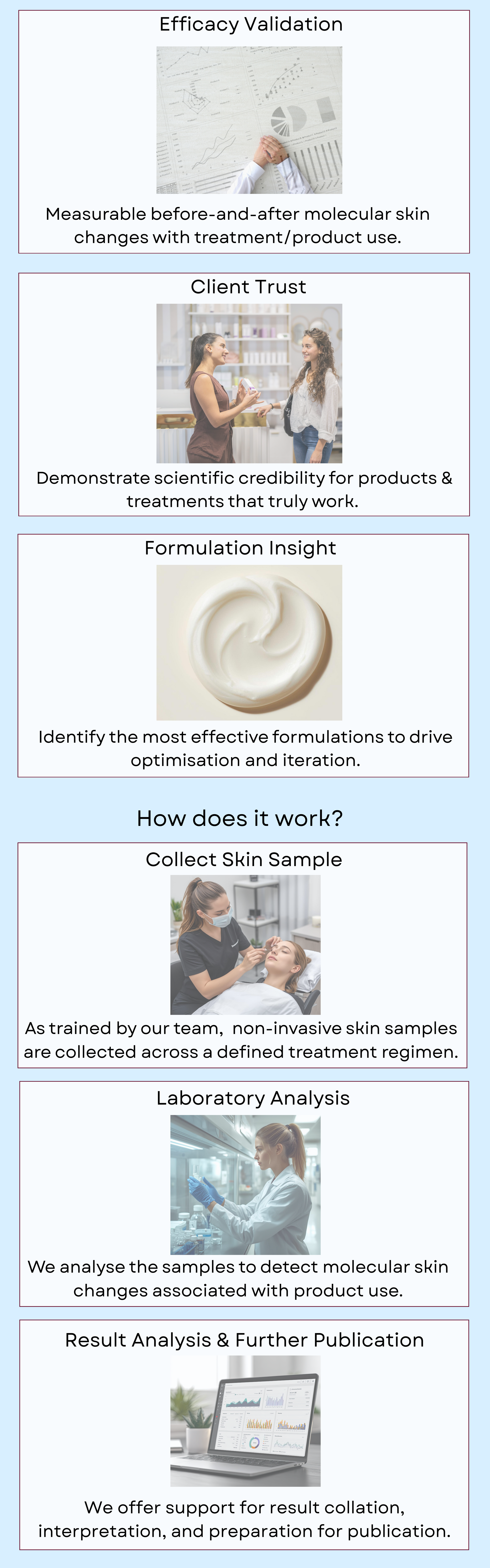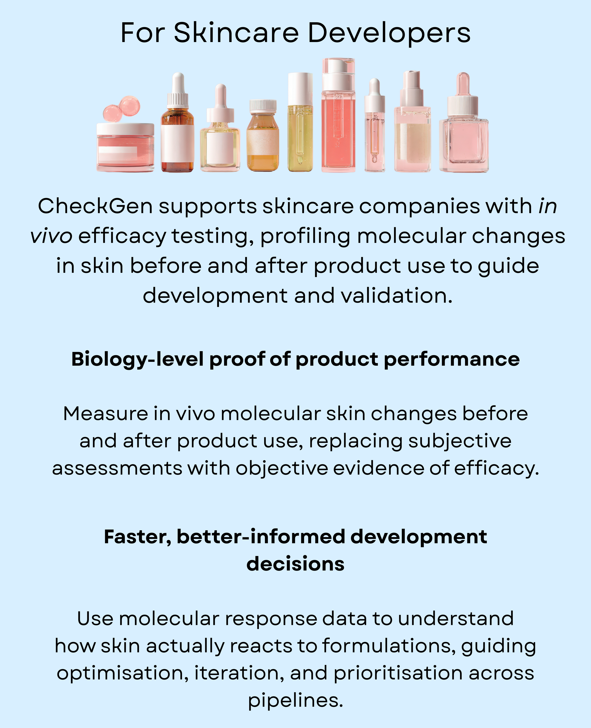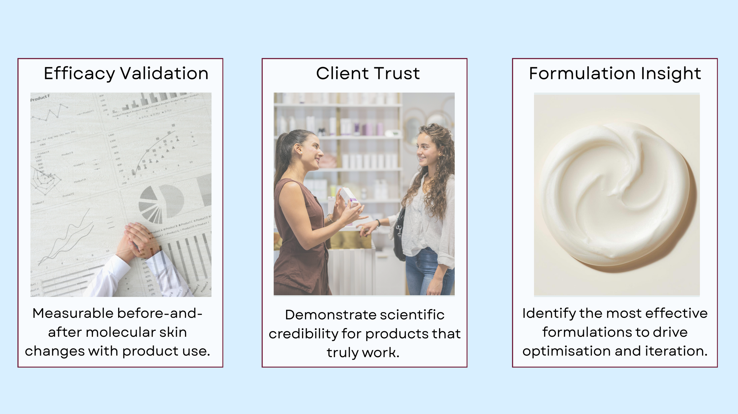 We work with skincare companies to integrate science-led efficacy and molecular insight into product development, supporting confident formulation decisions and measurable results.